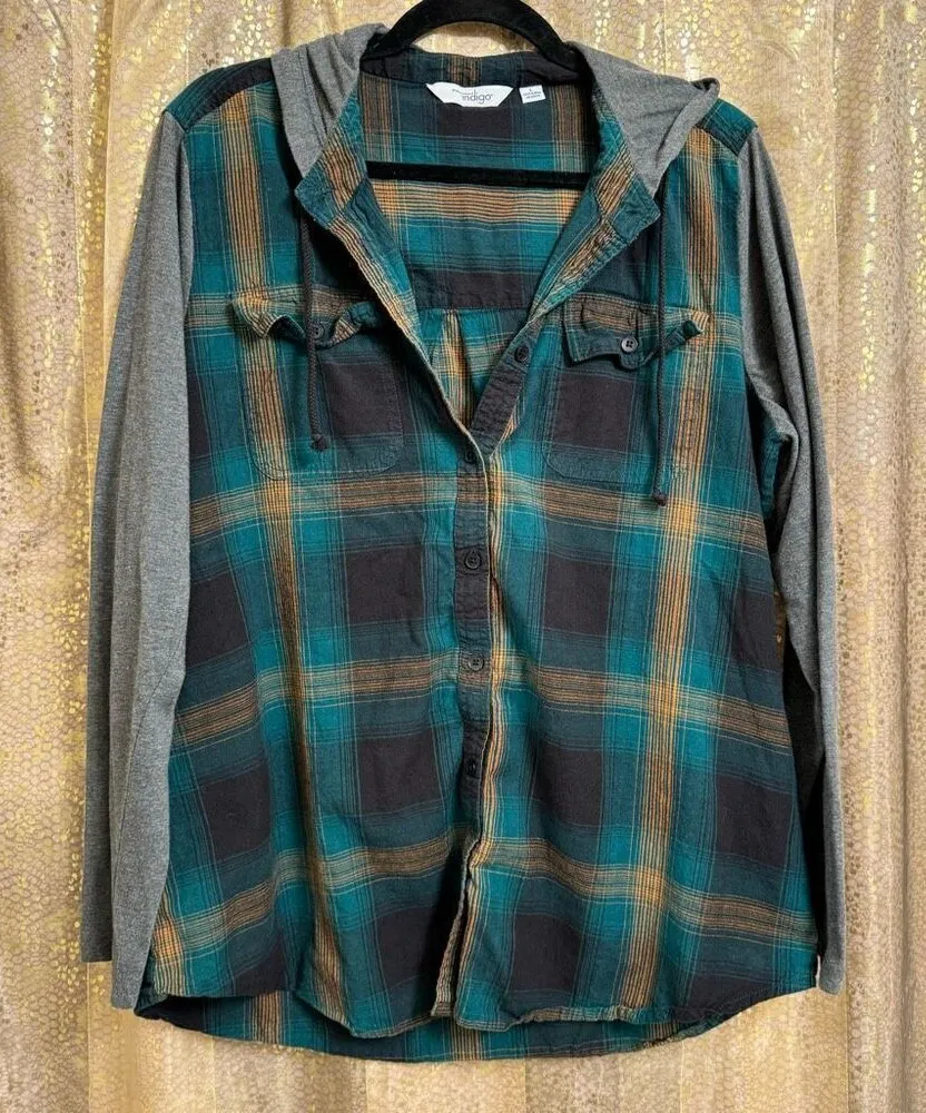 Great Northwest Indigo Fall Teal Green Gray Button Front Hooded Top Large Great gently used condition, smoke free home. No flaws. Cute and comfortable to wear all Fall and Winter long over a t-shirt. Perfect to wear to the Pumpkin Patch! Size large, not much stretch. This did come from a cat friendly home, it has been washed and I have done my best to lint roll any remaining stray hairs that are visible. If a couple possible strays hairs are going to bother you please do not purchase. Pit to pit laying flat across approx: 23” Top of shoulder to bottom hem approx: 28”
