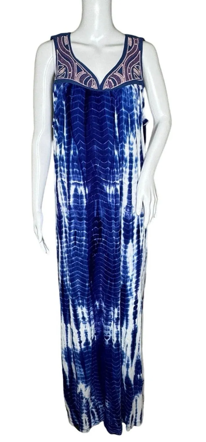 Greater Good Dress Womens XL Blue White Tie Dye Sand & Surf Beaded Boho Hippie Women's Size XL Extra Large Sleeveless V-Neck Hand Beaded Yoke Midi Length Side Slit Gauzy Material Pullover Style 100% Rayon 100% Cotton Yoke Festival Beach Vacation Cruise Casual Measurements are Approximate: Length 57" Armpit to Armpit 20" Slit 13" New with Tag (H6)