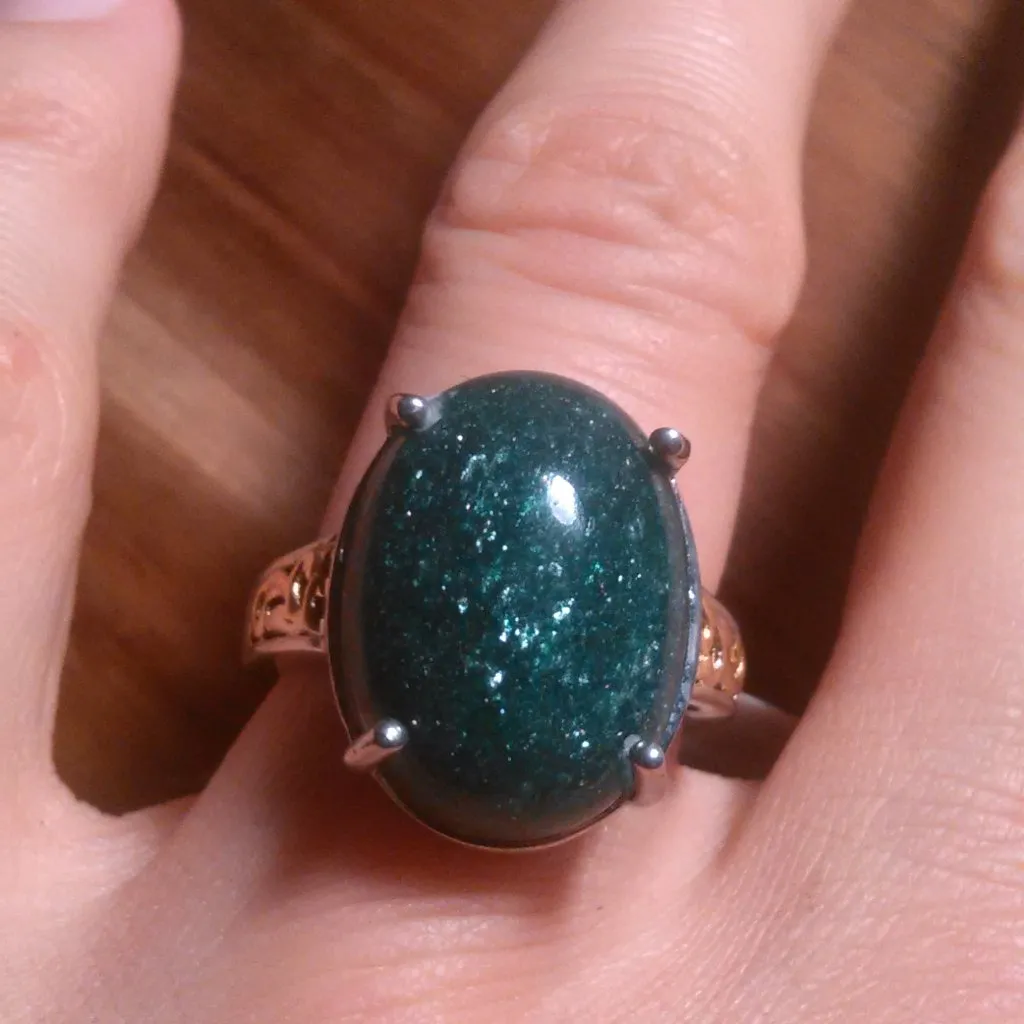 This solitaire ring features the gemstone green aventurine stone and has gorgeous detail work on each side of the band. The ring is set 18k yellow gold plated and platinum bond over brass. Size 7. 14.0 ctw. Brand new. B20