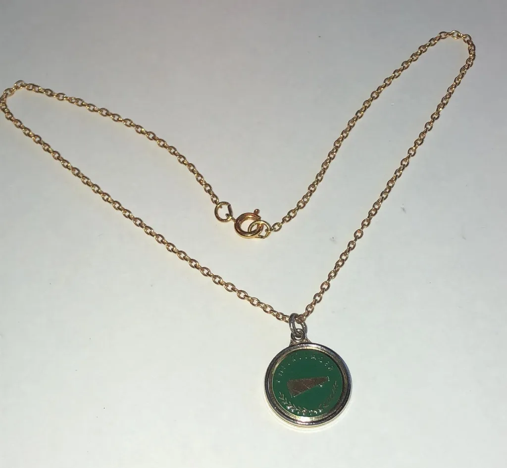 Round pendant with 'Cheerleader' text and megaphone design. Features green and gold colors. Good condition Approximately 1” pendant 15” chain F9 Boho Vintage Street Style Minimalist Statement Piece Essential Trendy Fashion Forward Must-Have On-Trend Cute Casual Edgy Classic Rare Find retro mid century modern estate jewelry costume jewelry