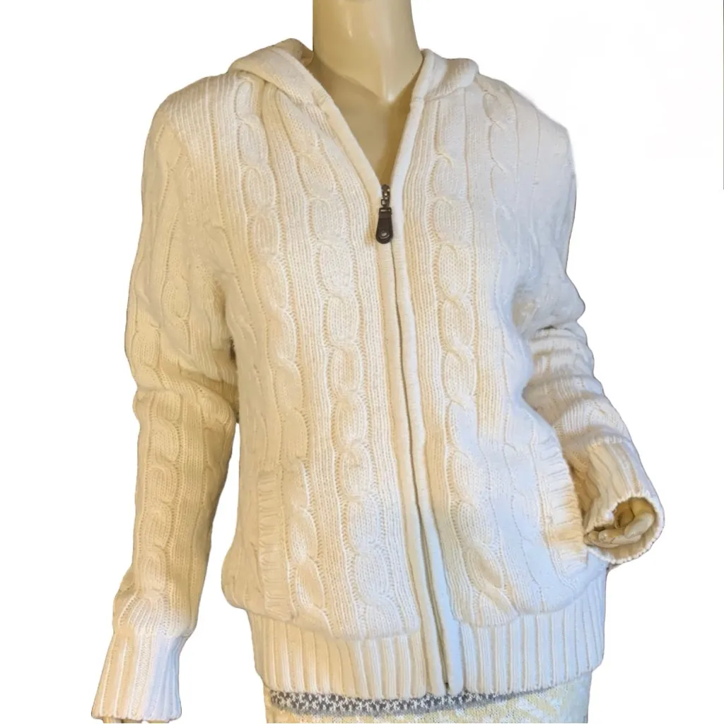 This listing is for the cardigan jacket pictured. Green Tea -cream manufacturer color"ivory" -chunky cable knit -faux fur lined -zipper front closure -hooded -pockets on hip sides -cardigan jacket style Cardigan is marked size large (40 inch bust) --please use measurements provided in photos for fit determination; Size tags alone, are not a reliable source. Item is free of stains or holes. New with tags