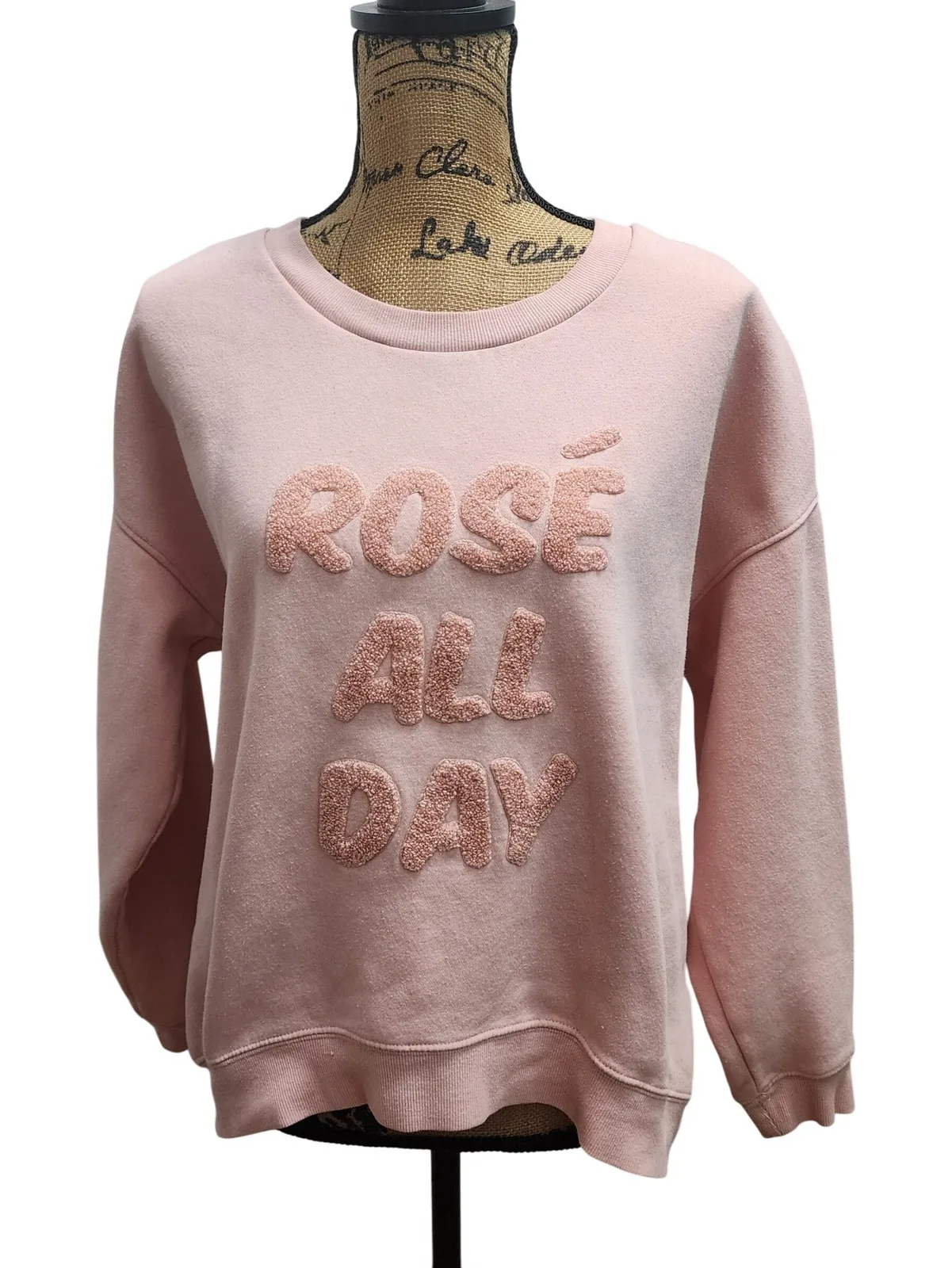 Adorable and comfy loungewear piece perfect for casual outings or cozy nights in. This light pink sweatshirt features the playful phrase "Rosé All Day" in a textured, raised lettering design. The crew neck and long sleeves offer a classic and relaxed fit. This sweatshirt is versatile for running errands, weekend brunches, or simply relaxing at home. Style: Pullover Color: Pink Department: Women Type: Sweatshirt Closure: Pullover Features: Graphic Print, Easy Care, Collarless, All Seasons, Stretch Fabric Type: Knit Character Family: Rosé All Day, Wine Lover, Girls Night Out, Brunch Crew Material: Cotton Blend, Polyester Blend Pattern: Solid Keywords: sweatshirt, crew neck, rose all day, pink sweatshirt, womens sweatshirt, casual top, loungewear, cute sweatshirt, green tea, ladies large, comfy sweatshirt, long sleeve, weekend wear, pink rose
