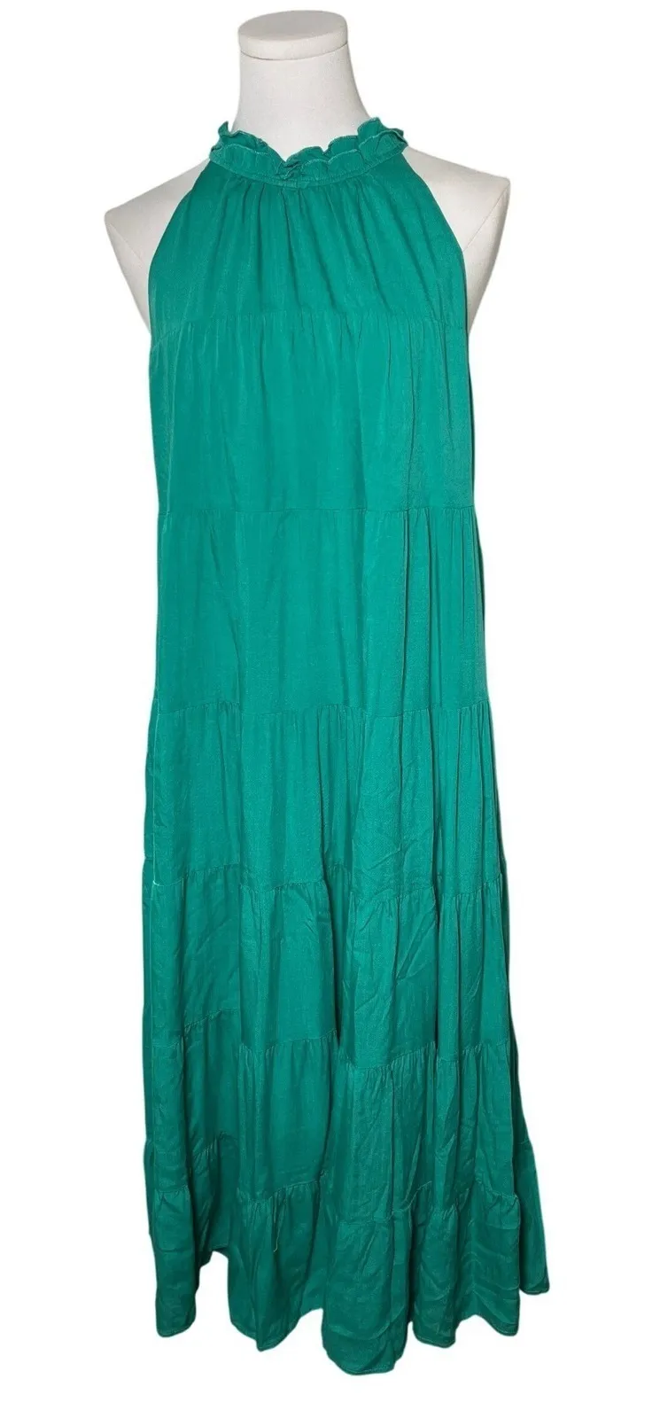 Flowy and feminine maxi dress by HAEOF. Bright emerald green with halter neckline. Tie-neck bow detail • Sleeveless • Tiered skirt. lined, pockets Lightweight 100% rayon for easy drape + movement. Details Brand: HABOF Size: Small (see measurements) Bust: ~18" pit to pit Length: ~48" Fabric: 100% rayon Condition: Excellent pre-owned, no signs of wear. Green Maxi Dress, Tiered Halter Dress, Tie Neck Sleeveless Dress, Rayon Summer Maxi, Resort Wear, Beach Vacation Dress, Boho Festival Outfit, Womens Small