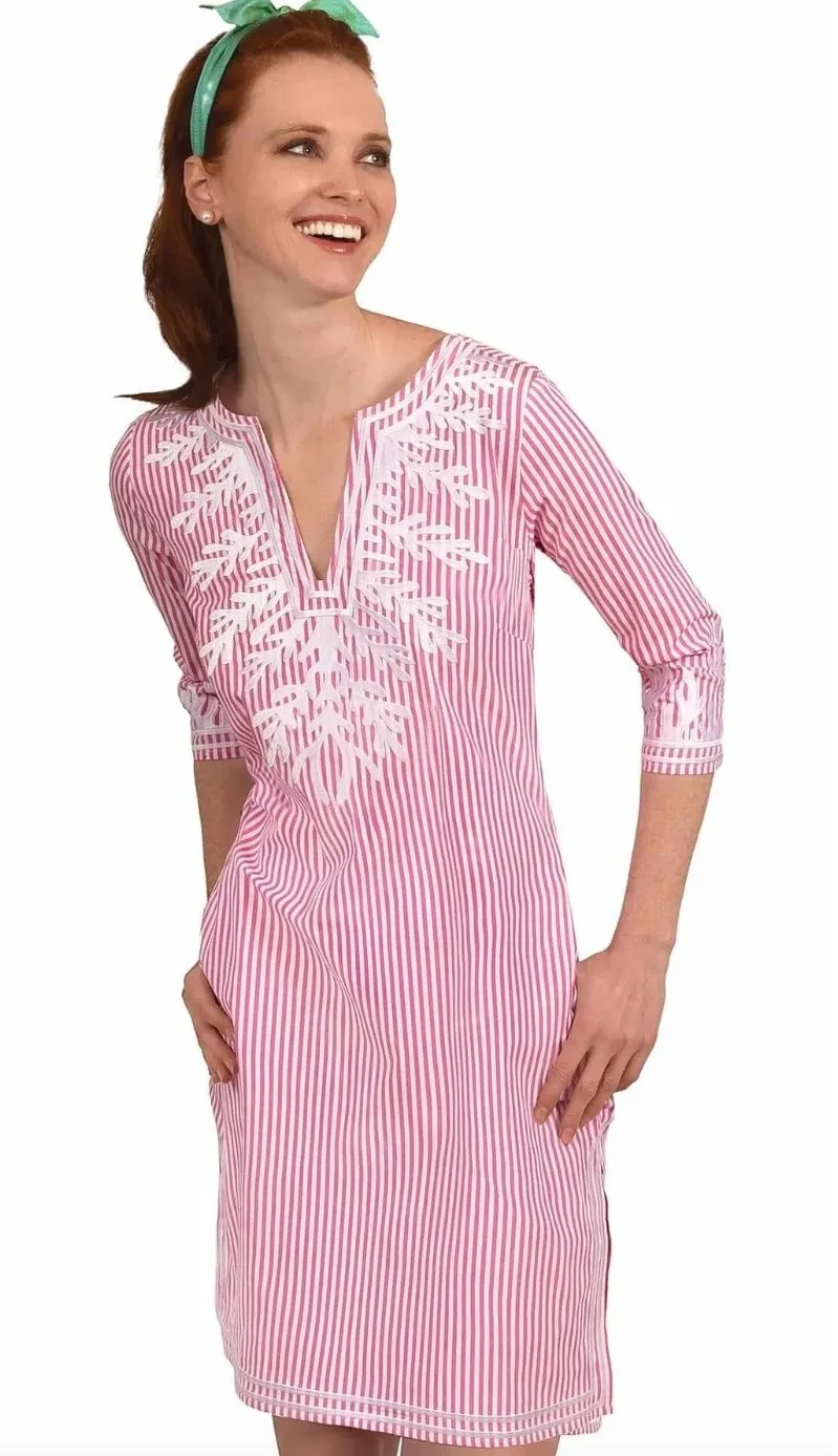 - Brand: Gretchen Scott - Size: Women's Medium - Color: Pink, White - Details: 3/4 Sleeve, Knee Length, V-Neck - Condition: Excellent Pre-Owned - Preppy, Coastal, Beach, Embroidered, Casual