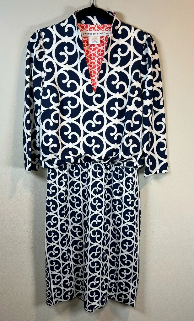 Gretchen Scott Heavens Gates So Sexy It Hurts Jersey Dress Navy White Swirl Print Pull Over 3/4 Slee... Show more