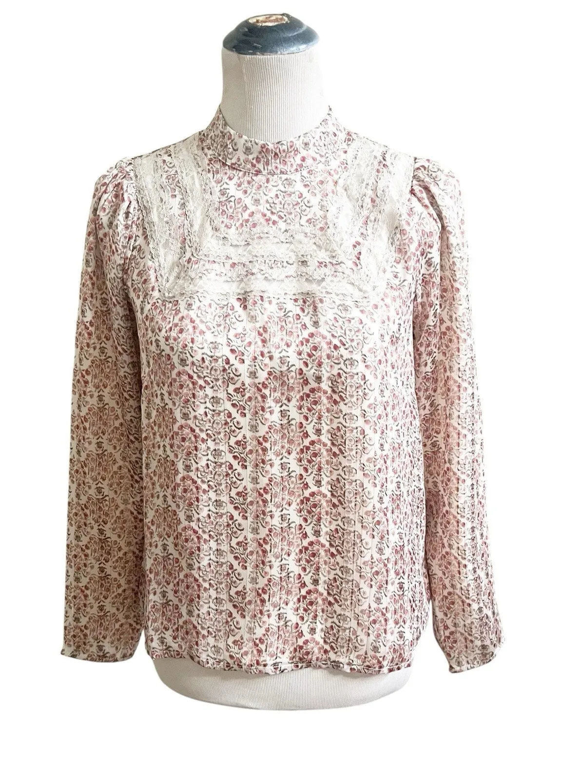 The Greylin High Neck Crochet Yoke Cottage Core Peasant Blouse in size XS and pink color is a versat... Show more