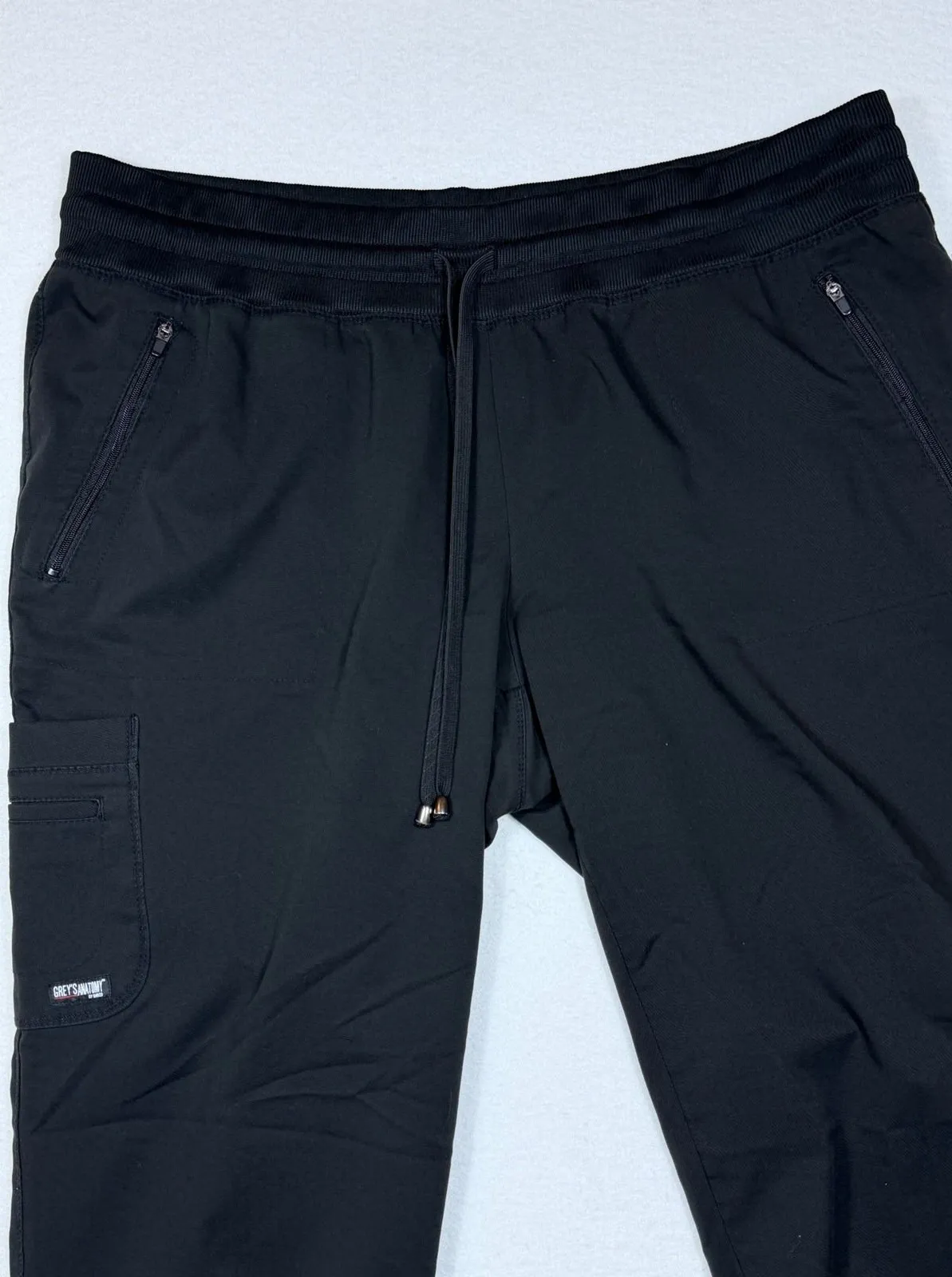Elevate your workday comfort with these Greys Anatomy Professional Wear By Barco jogger scrub pants. Designed for ultimate flexibility and ease of movement, these black pants feature a flattering jogger silhouette with a comfortable elastic waistband and drawstring. Multiple zippered pockets and a cargo pocket offer ample storage for your essentials, keeping everything you need within easy reach. Measurements: • see pictures Department: Women Style: Jogger Type: Pants Performance/Activity: Gym & Training, Running & Jogging Product Line: Grey's Anatomy Professional Wear Leg Style: Tapered Features: Pockets, Elastic Waist Occasion: Workwear, Activewear, Casual Material: Polyester, Spandex Closure: Drawstring Fit: Relaxed Pattern: Solid Keywords: scrub pants, jogger pants, healthcare apparel, medical uniforms, workwear, stretch fabric, athleisure, comfortable, functional, professional wear, storage, zippered pockets, cargo pocket