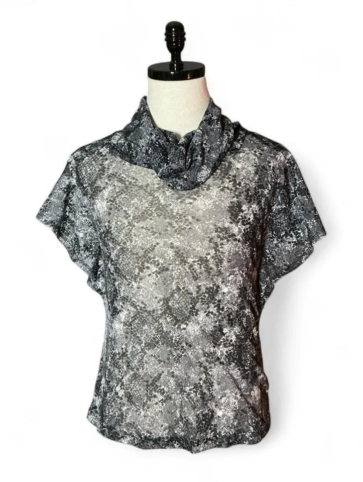 GRNV women's top in black and gray with a striking snake print. This piece features a sophisticated cowl neckline and delicate flutter sleeves, offering a chic and stylish silhouette. Perfect for a night out with friends or a stylish office ensemble. Keywords: snake print, cowl neck, flutter sleeve, sheer, lightweight, statement top, animal print, contemporary, evening wear, casual chic, fashionable, modern #Mesh #Lightweight #Contemporary