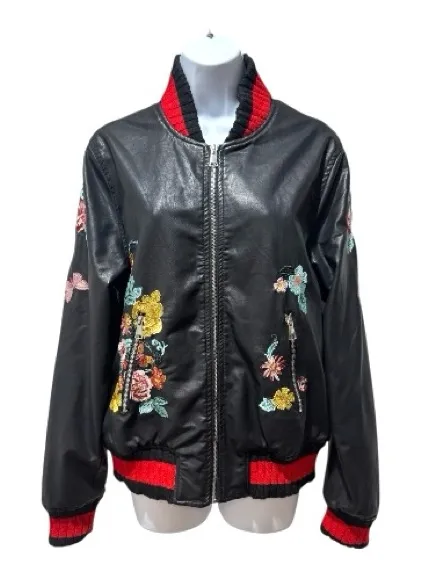 Statement Groovy Monkey black faux-leather bomber jacket with gorgeous multicolor floral embroidery on the front and sleeves. Finished with bold red-and-black striped ribbed trim and a full zip front. Stylish, unique, and perfect for layering. Condition: Preowned and in excellent condition overall. Minor pilling on the cuffs and hem has been carefully cleaned and reduced (see photos). No holes, tears, or major flaws. Material: Faux leather (polyurethane) with polyester backing. Color: Black with multicolor floral embroidery Size: Large Approximate Measurements: • Armpit to armpit: 21” • Length: 25” • Sleeve length: approx 26” Details: • Faux leather shell • Floral embroidery on front and sleeves • Red + black ribbed cuffs, collar & hem • Full zip front • Soft inner lining • Lightweight but structured feel • Trendy statement bomber Style Tip: Wear with black jeans and boots for a bold streetwear vibe, or layer over a simple tee to instantly elevate your look. 🐝
