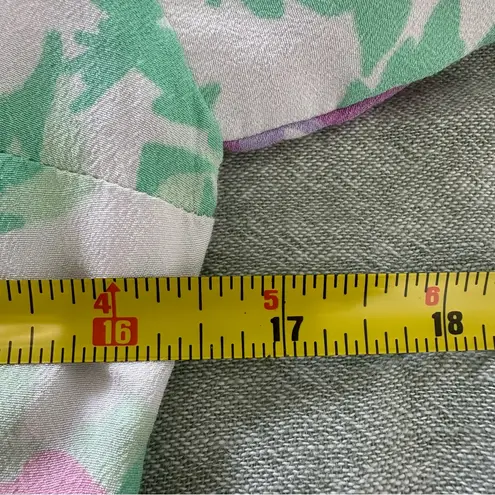Chic mini dress with floral print. Features pink, purple, and green hues. Puff sleeves and side tie... Show more