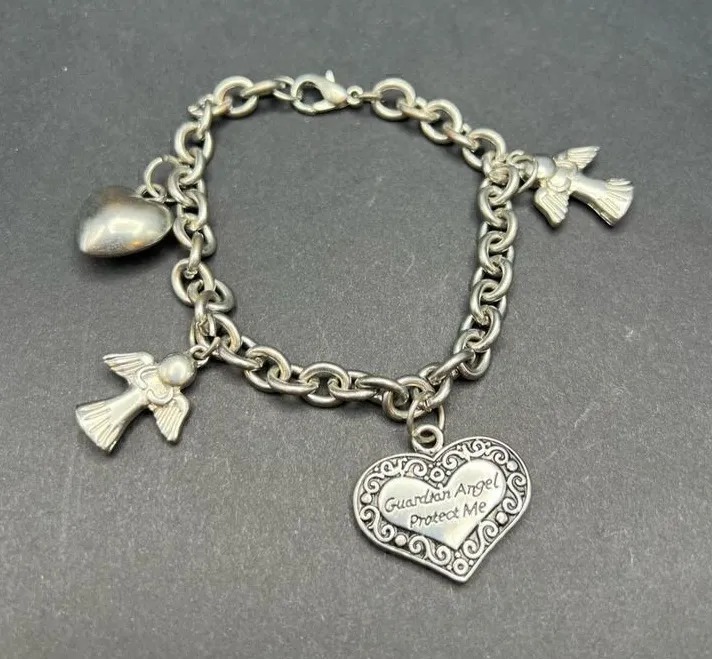 Guardian Angel Heart Silver Tone Fashion Charm Bracelet This silver tone fashion bracelet has 2 angel charms, a heart charm, and a larger heart charm that reads "Guardian Angel Protect Me" Approximately 8 inches from end to end. Lobster claw clasp.