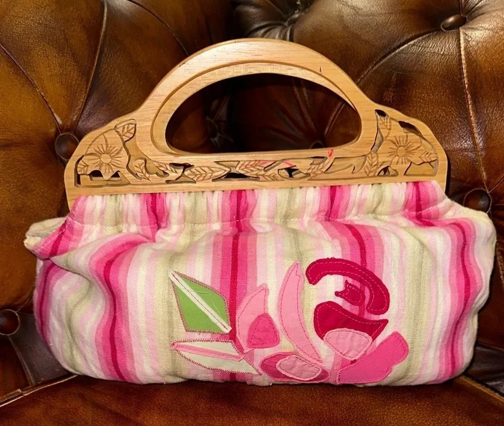 GUC Vintage Banana Republic Linen Bag with Carved Wooden Handles SIZE 14.5”X 8.5” The front part... Show more