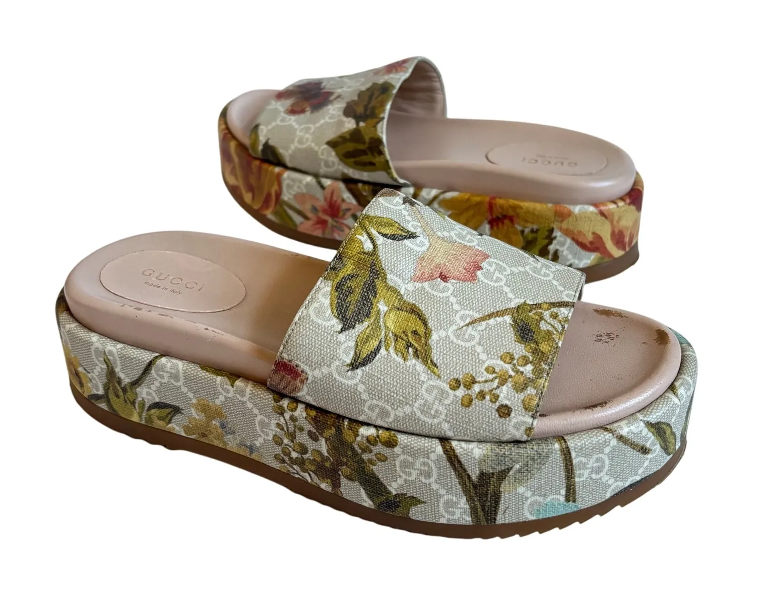 Gucci Angelina Platform Slide Sandals Flora GG Monogram Canvas Size: EU 38 US 8 Color: Gray, Green,... Show more