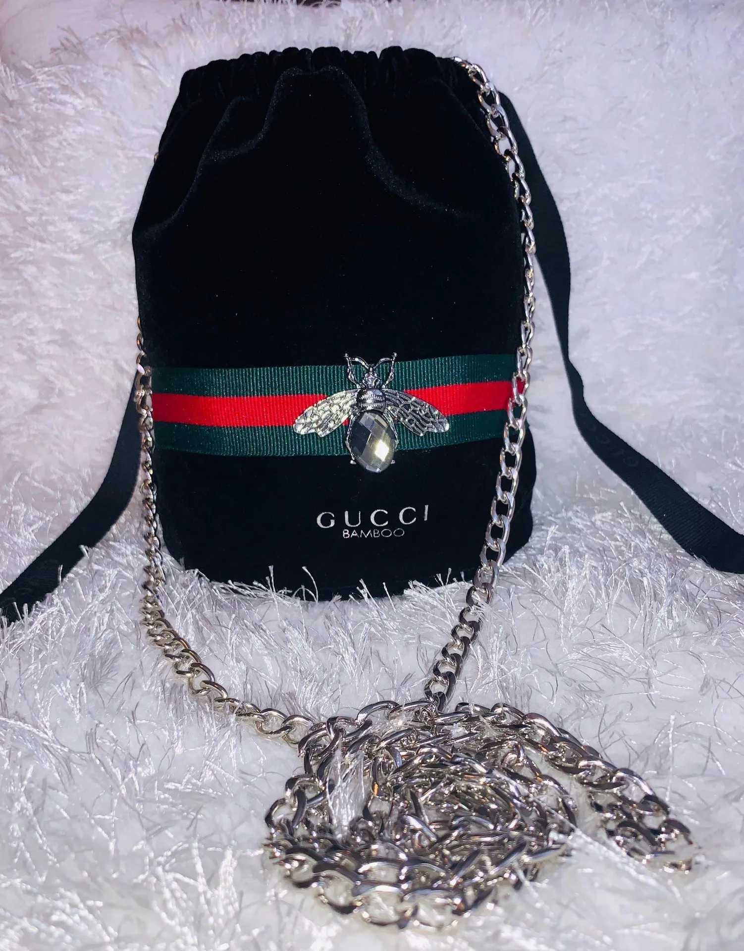 Upcycled authentic designer bucket bag Authentic black ribbon used for drawstring Quality red and green ribbon A little bling bee for the finished complete look Rivets placed in the inside Gunmetal Crossbody chain is detachable No rips or tears Never been used Velvet Size : 6 1/2 L X 5 w Can put phone and makeup and keys *** more like this coming *** Authentic with pic of tag and receipt to show it’s from Gucci bamboo perfume