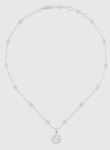 Gucci sterling silver necklace with interlocking G pendant and flower chain detail. Adjustable lengt... Show more