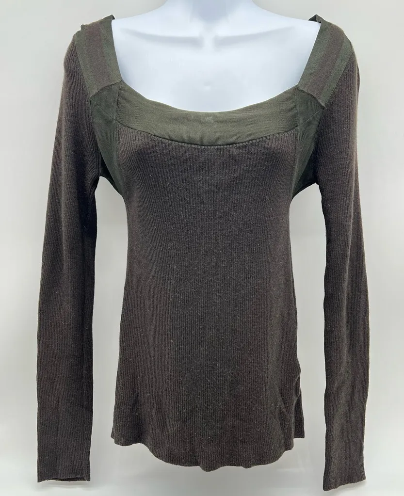 Chic long sleeve top with olive and brown tones. Soft fabric for comfort. Stylish square neckline.... Show more