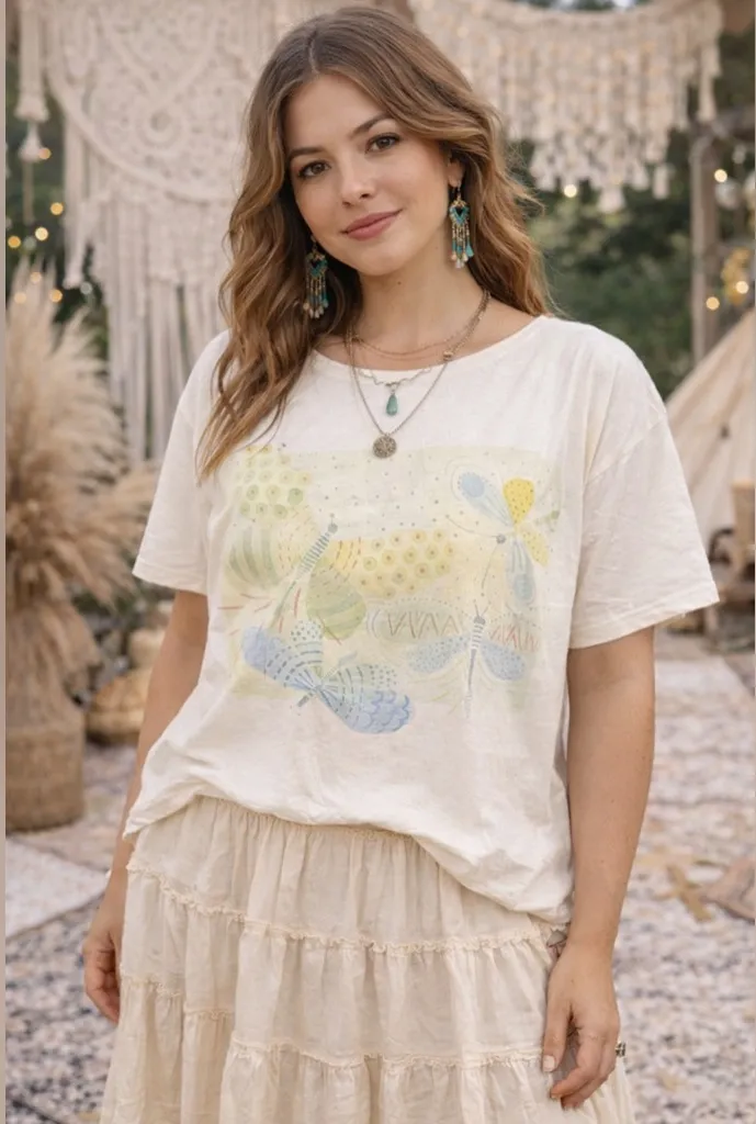 Beautiful Gudrun Sjödén boxy tee in a soft natural cream shade, featuring a whimsical butterfly and... Show more