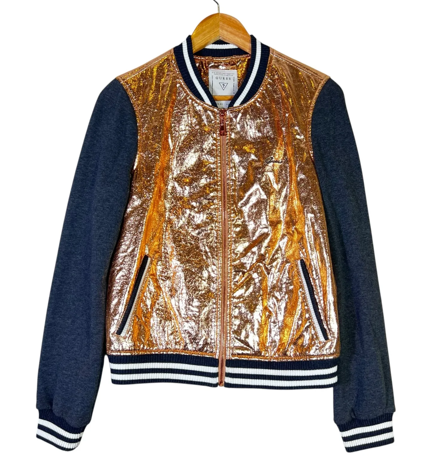 Shiny metallic front panels Gold foil finish Ribbed striped trim Varsity bomber style Zip closure Si... Show more
