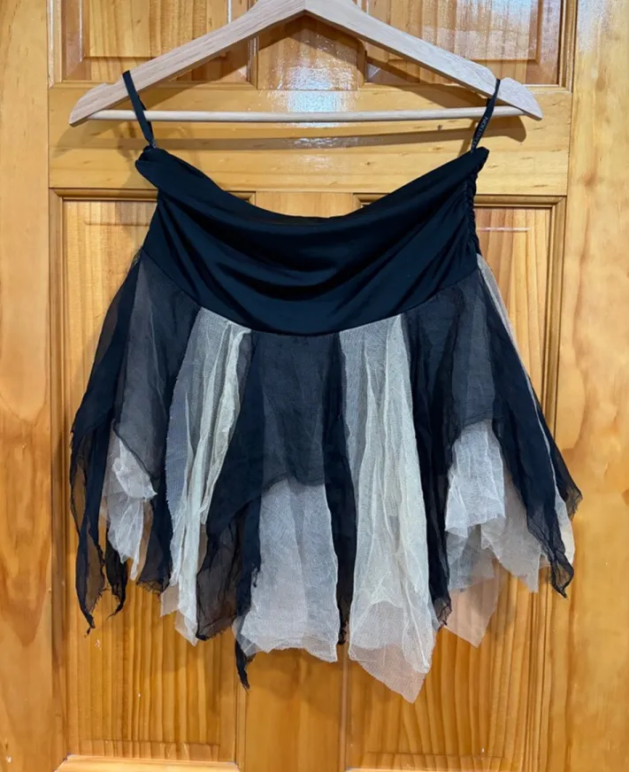 uess Collection (GC) layered tulle cami top with black + beige mesh panels and a shredded handkerchi... Show more