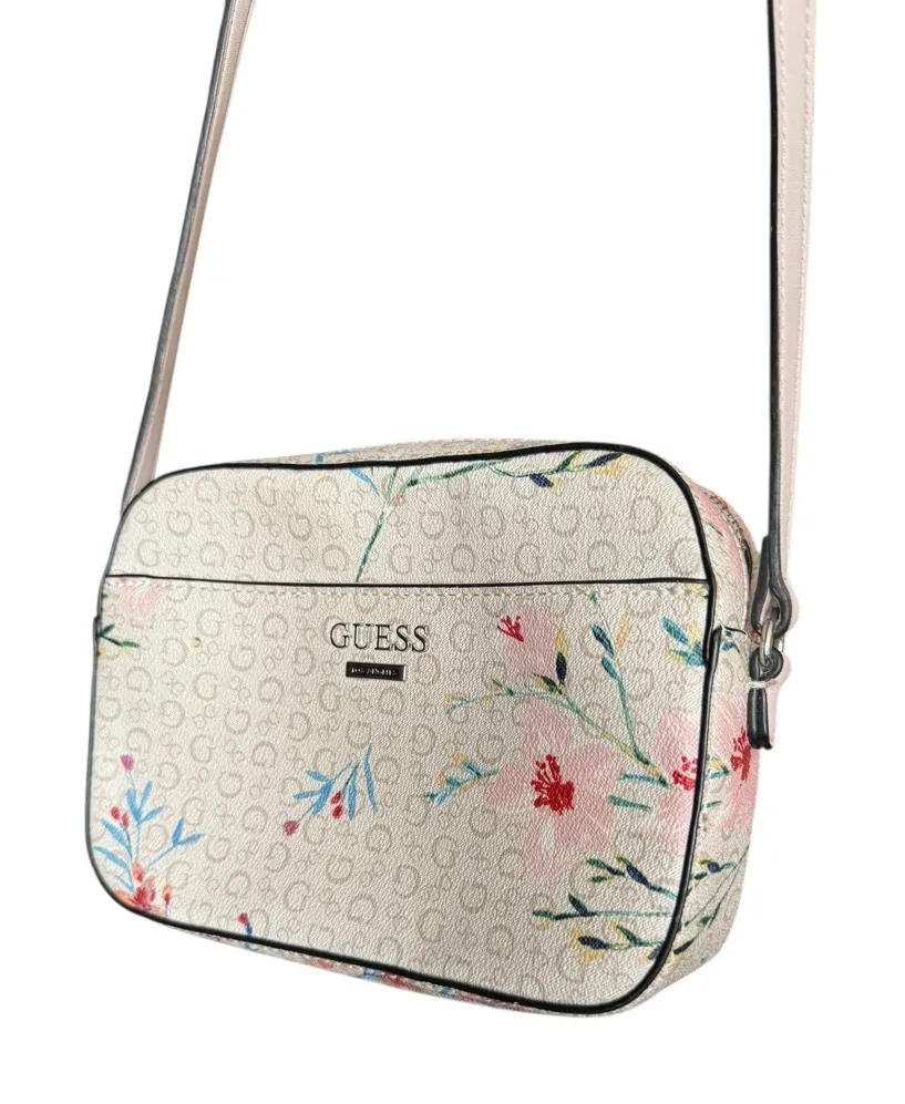 Chic GUESS crossbody with floral accents. Cream base with vibrant design. Perfect for any outing. G... Show more