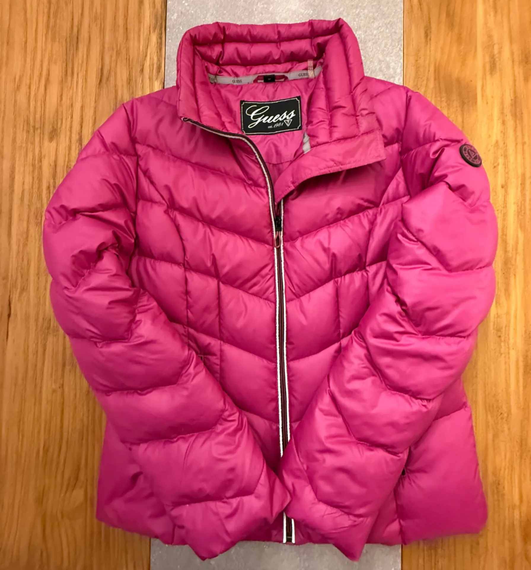 Keywords: GUESS, Puffer, Puffer Jacket, Down Blend, Quilted, Hot Pink, Fuchsia, Bright Pink, Pink Jacket, Pink Coat, Women's Medium, Outerwear, Winter Coat, Lightweight Puffer, Packable, Designer, Guess Est 1981, Y2K, Barbiecore, Athleisure, Sporty, Streetwear, Cozy, Insulated, Down Fill, Feather, Quilted Jacket, Vibrant, Layering, Retro