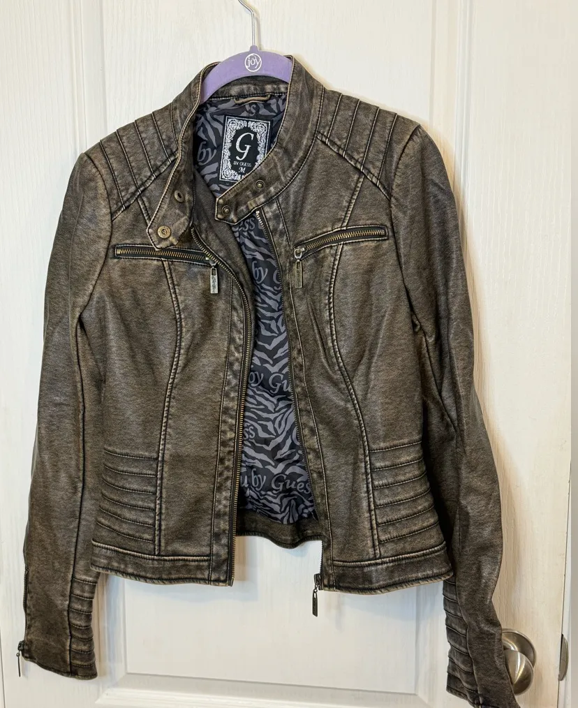Chic Guess jacket in metallic gold. Features a sleek design with bold accents. Please look at all pi... Show more