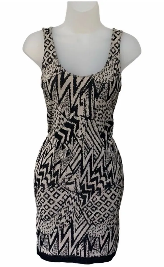 Sleek and retro Guess bodycon mini dress featuring a bold black and tan geometric pattern. Sleeveles... Show more
