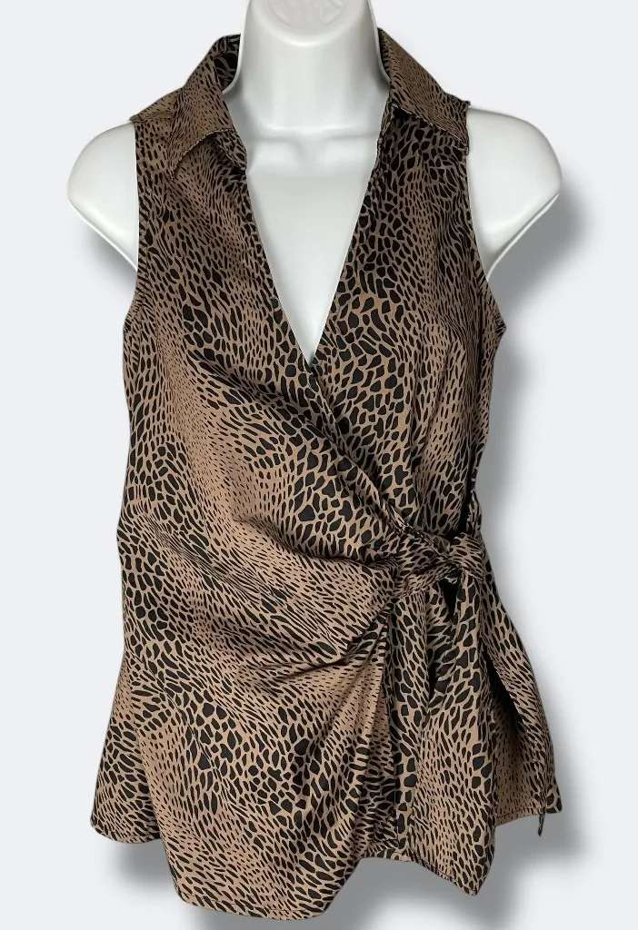 GUESS women's sleeveless wrap top in black and brown animal print. Ties at the side and has a button... Show more