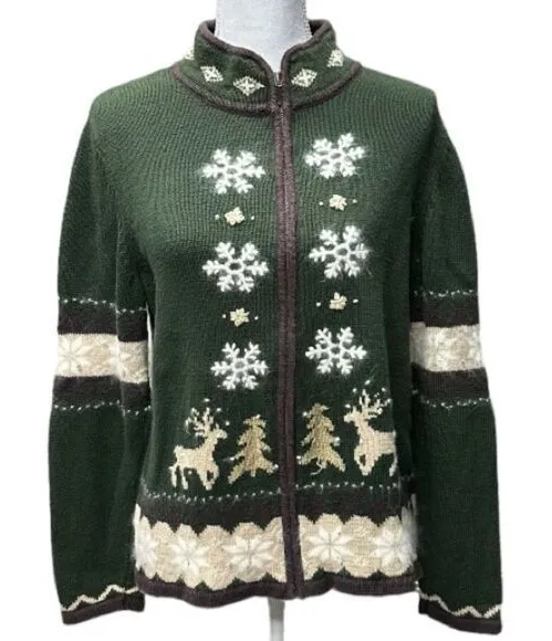 This green, cream, brown and white sweater has gorgeous snowflakes, trees and reindeer on it. The an... Show more