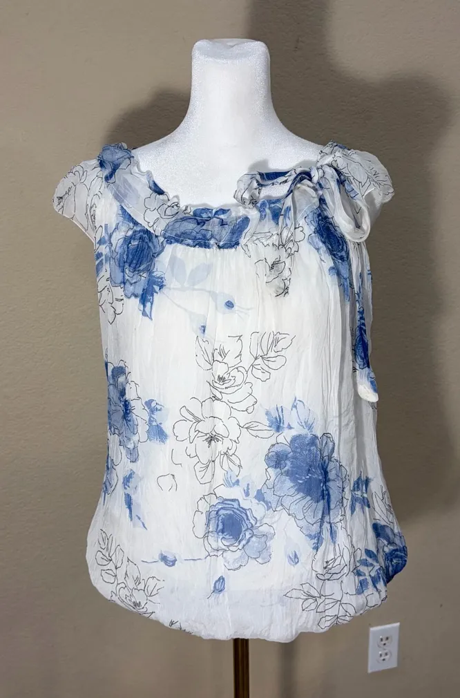 The Guisy Made In Italy top is a stylish and versatile piece perfect for the modern woman. This women's top features a round neckline, pullover closure, and wide straps, making it easy to care for and breathable for warmer seasons. The floral pattern in blue and white adds a touch of cottagecore charm, while the 100% silk material and Italian craftsmanship ensure high quality. Ideal for casual occasions, this basic tank top in size small is a must-have addition to any summer or spring wardrobe.