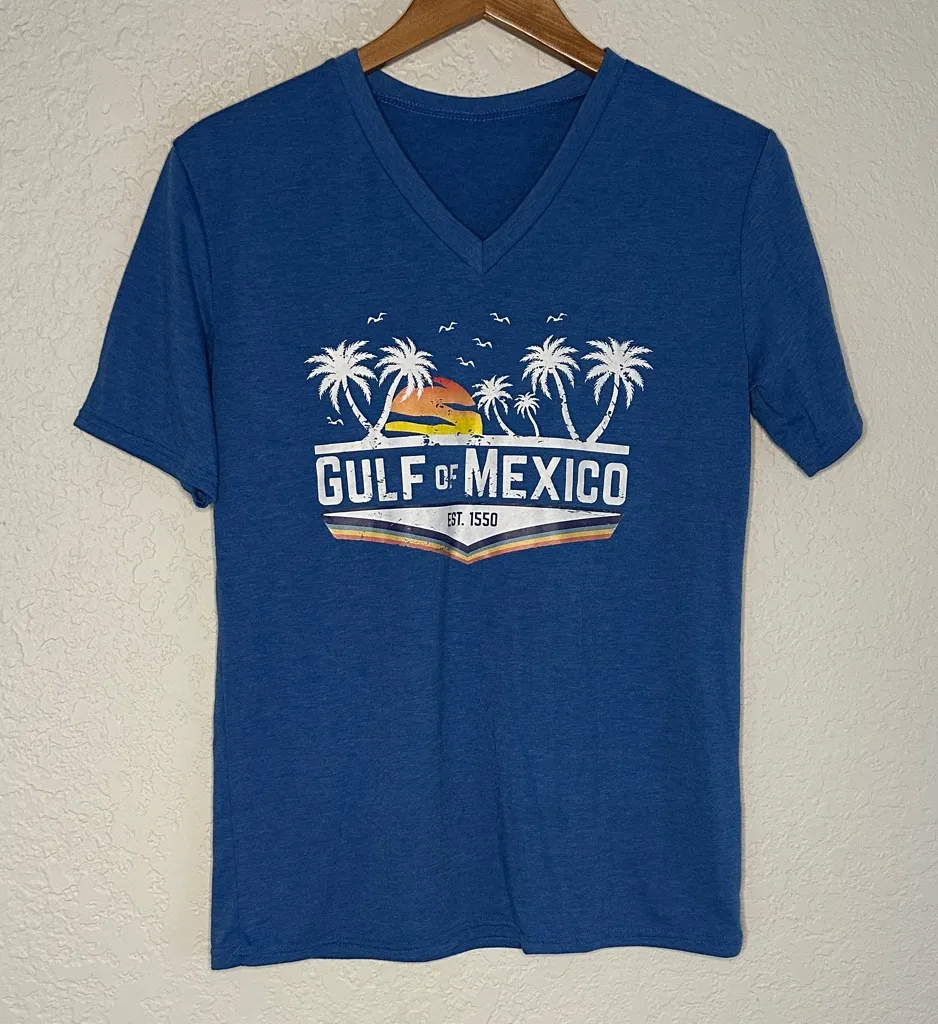 Gulf of Mexico T-Shirt Blue V Neck Small Unisex Graphic Palm Tree Est 1550 - $19 - From Audra