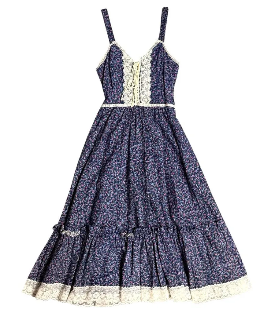 Floral Prairie style cottage core lace up maxi dress Tiered ruffle skirt with lace trim 100% cotton Vintage 1970s Back zip closure See photos for approximate measurements All items come from a pet friendly and smoke free home.