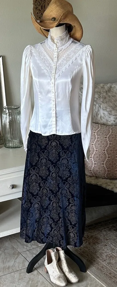 Great Vtg used condition !!! Not is perfect shape But no noticeable flaws to me ! 🤩 Absolutely stunning for every day wear or a fun costume idea Med or 6 on both , vintage sizing though Selling the set together Let me know if you just want one piece:) Offer and bundle 💗 ✌️ Ask any questions:) Skirt is : Navy gold velour velvet floral embossed midi Brand is gotcha covered USA made Hips are a 21” across Top to bottom 35” Top is : Jessica’s Gunnies San Francisco 🤩 Not sure material 16” pit to pit 21” top to bottom Prairie, cottage vintage Victorian, romantic, feminine Halloween, wedding guest, old school farmhouse,