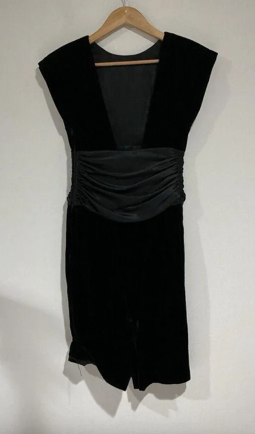 Elevate your wardrobe with this stunning black velvet knee-length sleeveless dress from Jennifer Moore Petites. This pencil dress is tailored to flatter your figure and features a low back design that adds a touch of sophistication to the overall look. The dress is made from high-quality velvet fabric. The dress features padded shoulders, cap sleeves, zip up back closure, and a banded belt feature. The dress is perfect for any formal or semi-formal occasion, and the knee-length cut adds an elegant touch to your outfit. The dress is available in a size 2 and is suitable for petite women. The dress comes in a classic black color that complements any skin tone and can be paired with any accessories to create a unique look. This dress is pre owned and in excellent condition!
