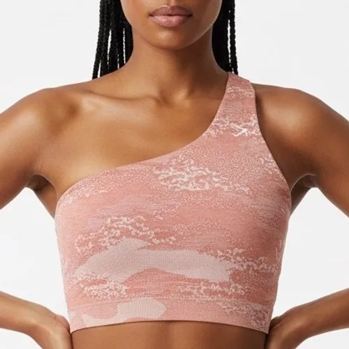 Seamless activewear sports bra in coral pink with a subtle camouflage pattern. This piece features a... Show more