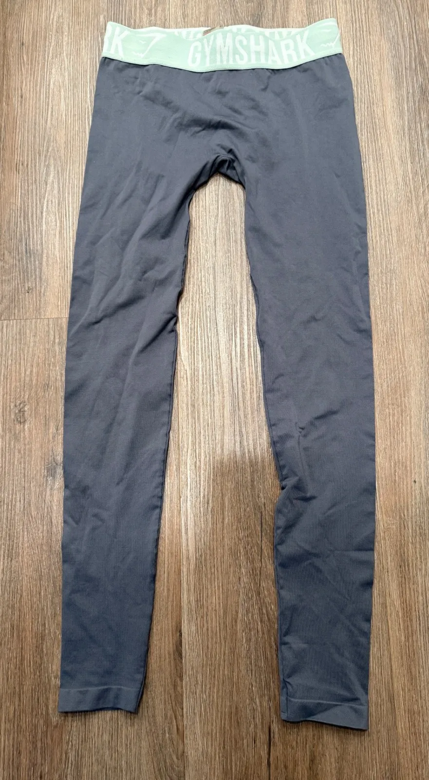 Charcoal grey Gymshark seamless leggings with a mint green logo waistband. These high-waisted leggin... Show more