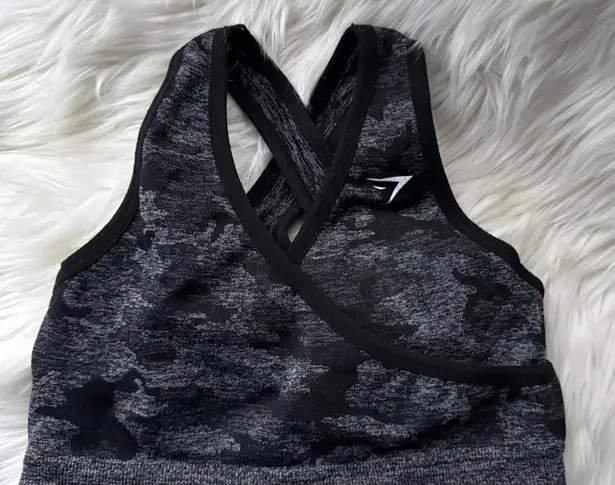 Gymshark women's sports bra in black and gray camouflage pattern. Comfortable and supportive for wor... Show more