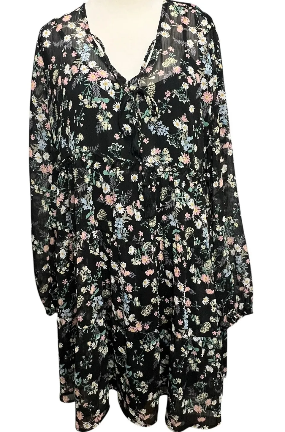 Gypsies & Moondust Babydoll Dress Womens Size L Black Floral Sheer Fairy Peasant Boho Excellent pre-owned condition Babydoll dress with attached underslip Pullover V-neckline with tassel tie Long sleeves; elastic cuffs Floral print Semi sheer fabric Ruffle trim Pleated 100% Polyester Machine wash cold pit to pit 20" sleeve 24" length 34.75" whimsygoth, bohemian, casual, party, western, colorful, whimsygoth, versatile, everyday, travel