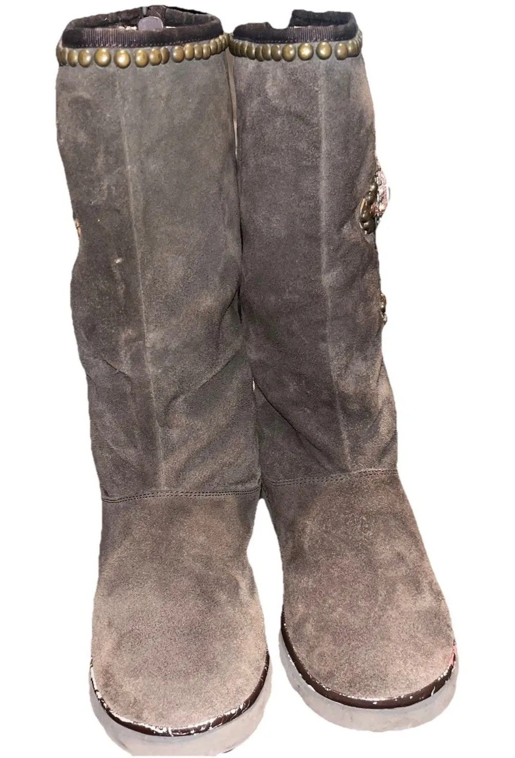 This is a pair of brown suede leather boots with a Swarovski crystal cross & rhinestone zipper accents by Gypsy Soule in a women's 10. They are in good pre-owned condition (SEE PHOTOS & READ DESCRIPTION). Features: * Genuine suede leather upper w handcrafted, tooled leather accents & stud outline * Hand-embellished w Swarovski crystals - each pair is unique & artisan-made * Swarovski crystals catch & reflect light beautifully, shifting appearance w angle (SEE PHOTOS) * Signature back zipper design w rhinestones running up shaft * Warm faux-shearling lining - perfect for cold weather * Leather insole for comfort * Boutique-level Western/boho style, handcrafted w recycled concho accents - per brand description * Perfect for collectors of Western/boho fashion or as standout holiday statement boot APPROXIMATE MEASUREMENTS: SHAFT HEIGHT - 14" SHAFT WIDTH - 5.5" CONDITION DESCRIPTION (SEE PHOTOS): * STRUCTURALLY SOUND W EXPECTED SIGNS OF WEAR * SUEDE SHOWS LIGHT MARKS * PAINTED TRIM AROUND SOLES HAS COSMETIC FLAKING FROM AGE * 1 HEEL SHOWS VISIBLE WRINKLING FROM WEAR * ZIPPER ALIGNMENT HAS SLIGHTLY SHIFTED - STILL FULLY FUNCTIONAL * ALL STUDS, CRYSTALS, AND RHINESTONES INTACT & SECURELY MOUNTED MEASUREMENTS ARE APPROXIMATE. FEEL FREE TO ASK QUESTIONS OR FOR ADDITIONAL PHOTOS BEFORE PURCHASING. READ DESCRIPTION AND SEE PHOTOS