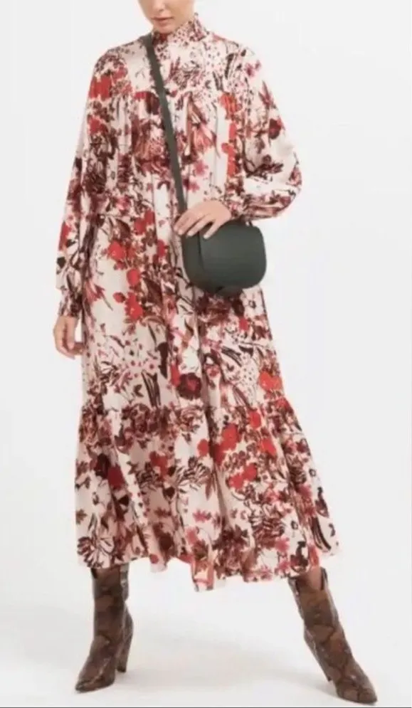 Chic floral design with long sleeves. Red and cream hues. Perfect for stylish outings.m dress in goo... Show more