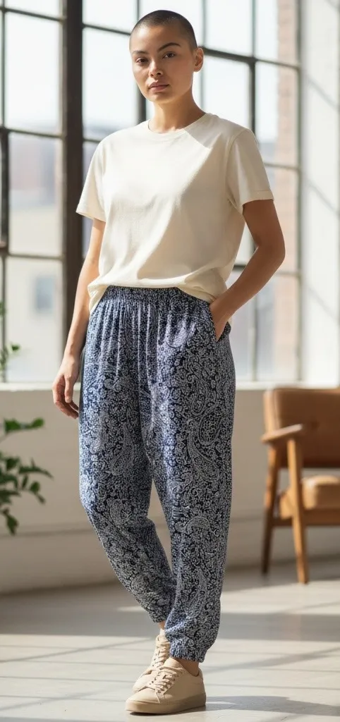 • Good Used Condition • H&M Basics Women's Medium Navy White Paisley Bohemian Harem Pants Travel Jo... Show more
