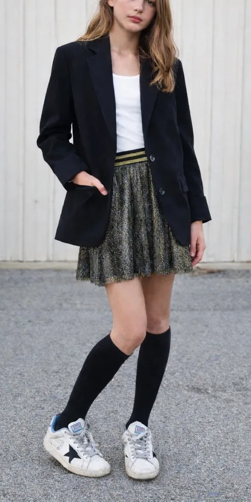 Chic black and gold metallic pleated mini skirt with a subtle shimmer that catches the light beautif... Show more