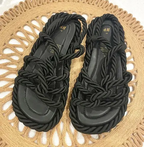 These are gently used H&M Black Robe Twisted Flat Open Toe Sandals Size EU 36/ US 5. In very good condition. Minor dirt on front rope on toes. See all pics for condition. Chic black rope sandals from H&M featuring an intricate braided upper and cushioned footbed for comfortable all-day wear. Designed with multiple twisted cord straps that create a modern, textured look while keeping the foot secure. The flat sole offers easy, everyday versatility—perfect for warm-weather outfits, beach vacations, casual weekends, or pairing with dresses, shorts, and flowy summer sets. Stylish and lightweight, these sandals deliver a contemporary boho-inspired feel with durable construction and effortless slip-on convenience. Sandals with twisted, rope-style foot straps. Soft, imitation leather insoles and fluted soles. Height of soles 1.5 cm. Black, Solid color No heel Strappy sandals Lining: Cotton 65%, Polyester 35% Sole: Thermoplastic rubber 100% Upper: Cotton 65%, Polyester 35% B12 Neutral Minimalist Contemporary Black Essentials Business Casual Casual Classic Workwear Oversized Knit Back to School Fall Fashion Spring Summer Vacation Trendy Winter