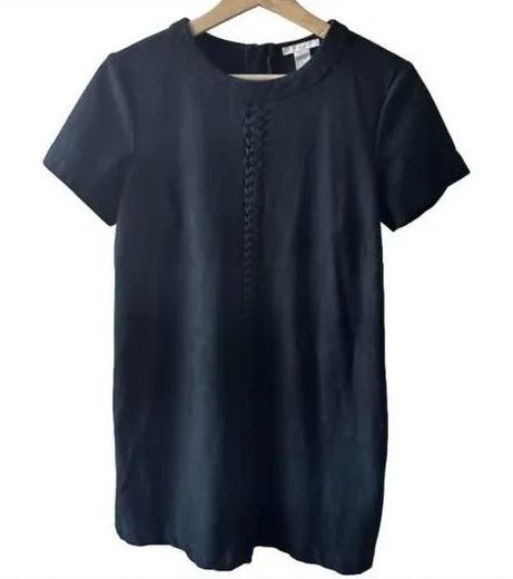 Elevate your wardrobe with this chic black microfiber mini dress, crafted in a suede-look fabric for a luxurious touch. This stylish piece features short sleeves and a unique whipstitch-style braided detail along the front center, adding subtle texture and elegance. Designed with a back zip and fabric zipper pull for easy wear, this dress offers a flattering, slightly stretchy fit.