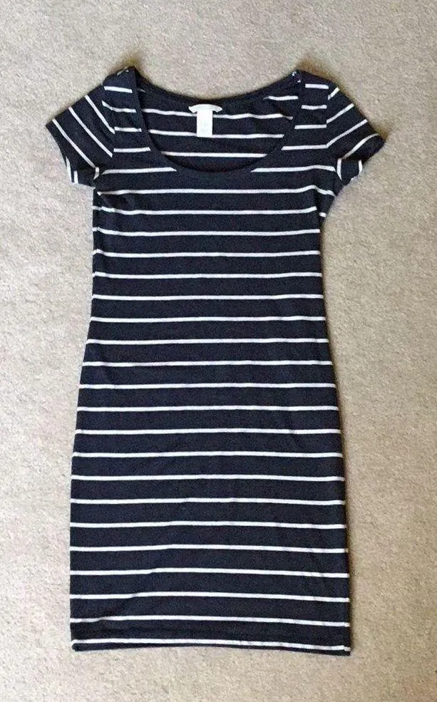 Cute, timeless H&M bodycon dress that hugs all your curves in a flattering way. Dark gray striped mi... Show more