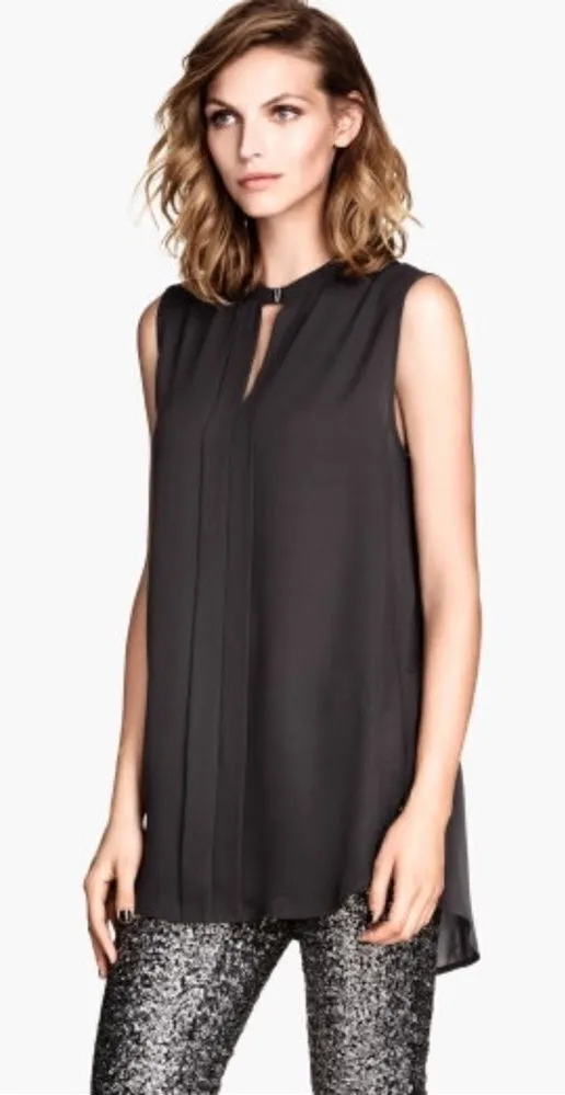 ✨Sleeveless blouse in airy, woven fabric. Pleats at front, metal buckle at neck, and rounded hem. Sl... Show more