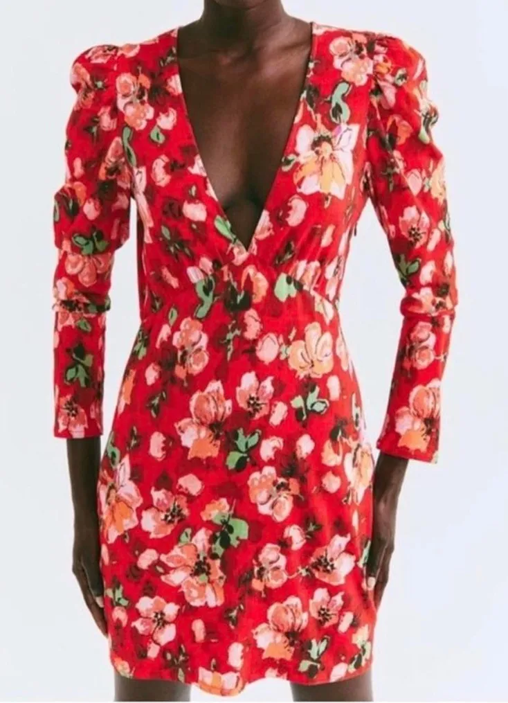 H&M women's red floral mini dress with long sleeves, puffed shoulders, and a plunging neckline. Zipp... Show more