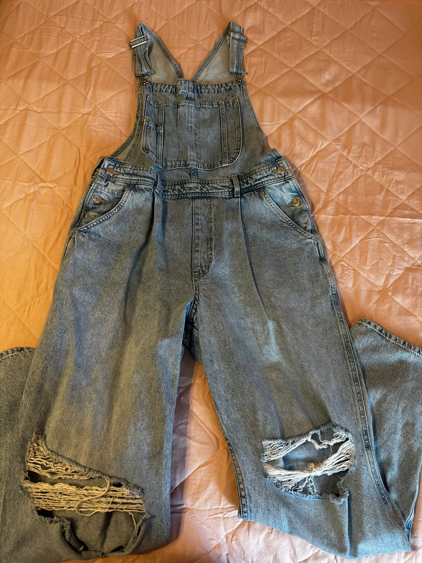 Size medium oversized overalls. Has a small stain (pictured) on the right leg.