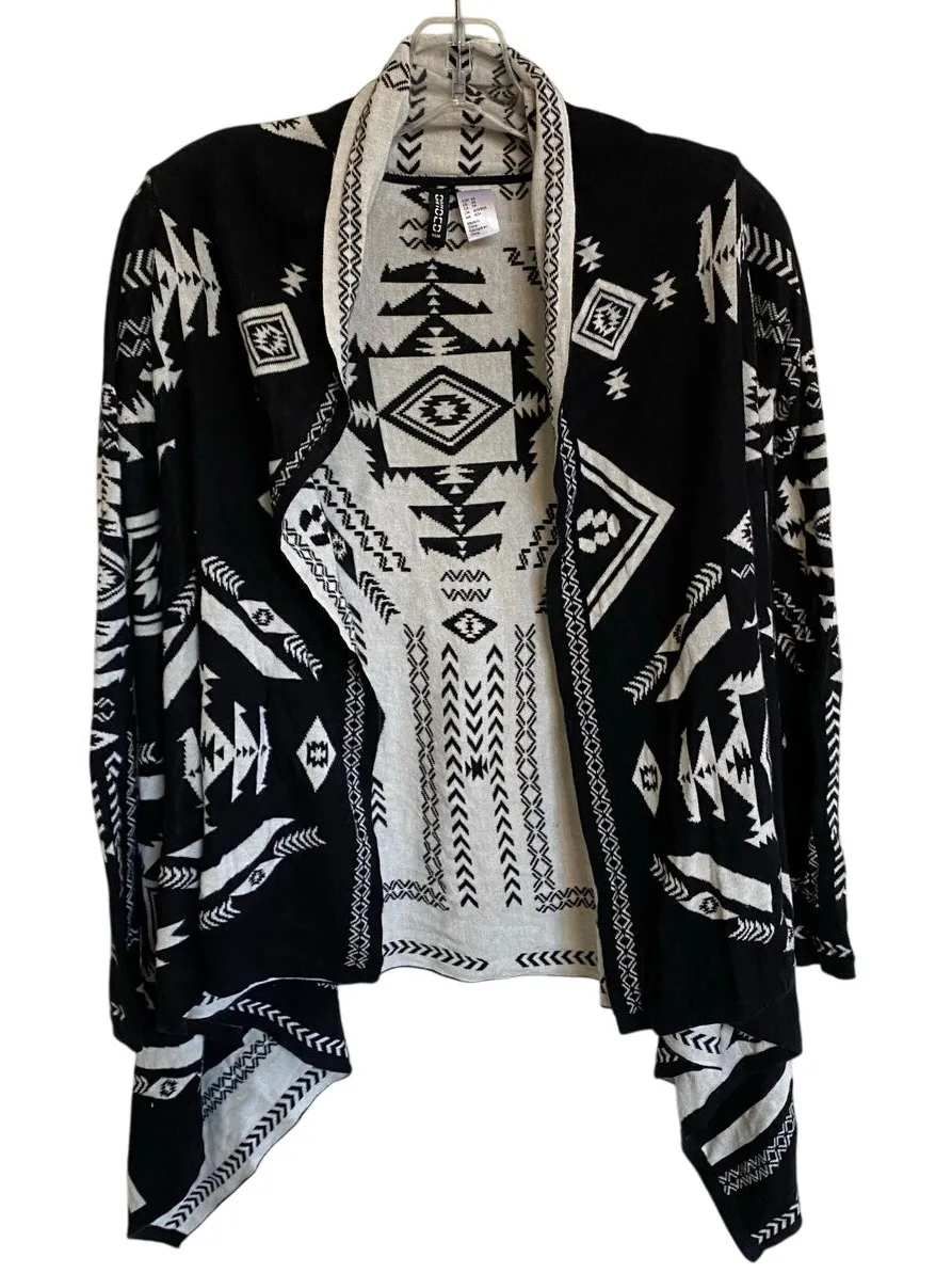H&M Southwestern print open cardigan. Cream and black colors, with inverted color scheme on inside. 55% acrylic, 45% cotton. Machine wash cold, lay flat to dry