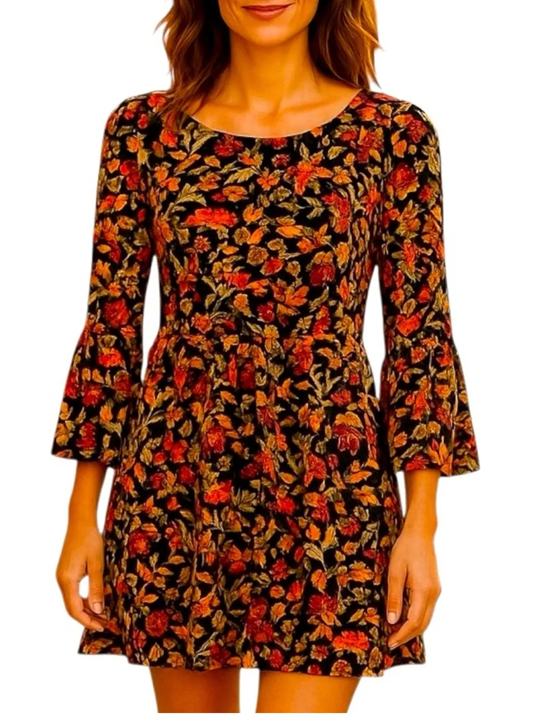 Turn heads with this H&M Divided Y2K mini dress, size 4, in excellent preowned condition. Featuring a bold black base with vibrant floral print in pink, orange, yellow, gray, white, and purple, this dress perfectly captures retro charm with modern wearability. The scoop neckline and elegant V-back with four buttons add sophistication, while long bell sleeves create dramatic, feminine flair. The drop waist and mini length evoke classic Y2K style, ideal for festivals, concerts, church, Easter, or casual outings. Lightweight, flowy, and comfortable for all-day wear. Smoke-free home; model photos for fit reference only.